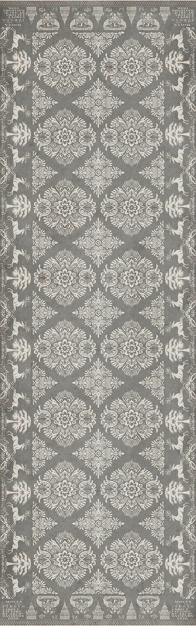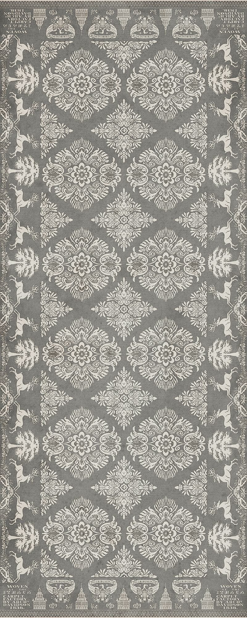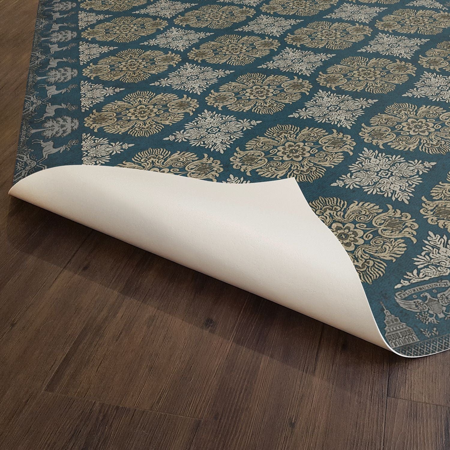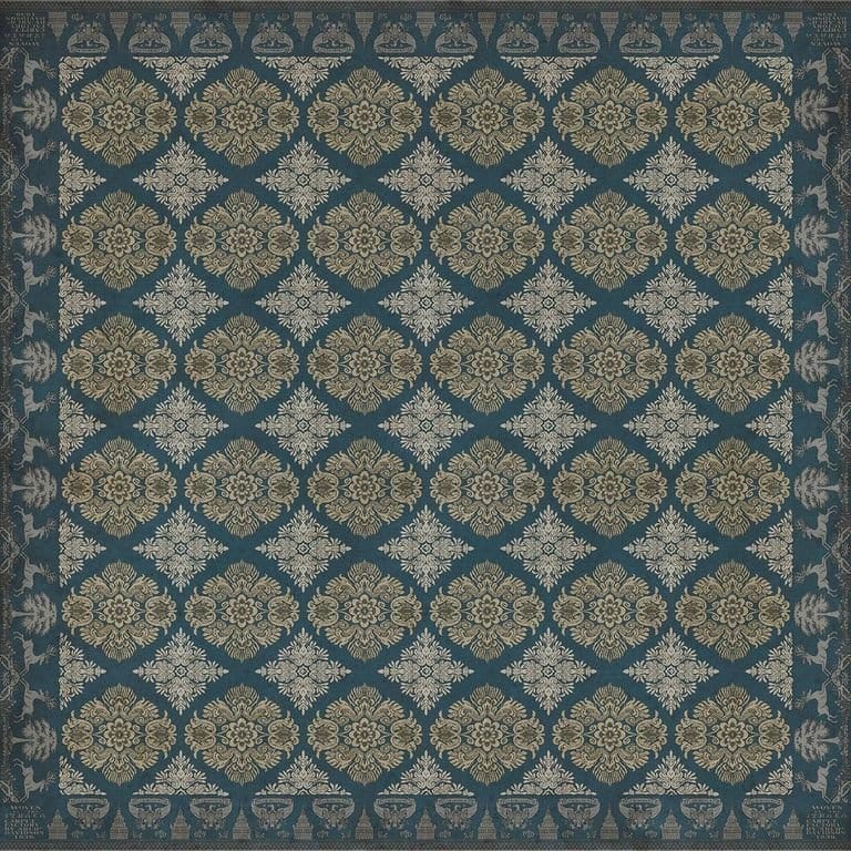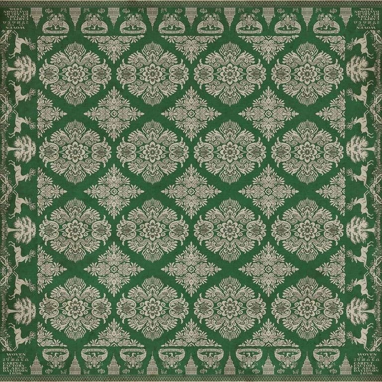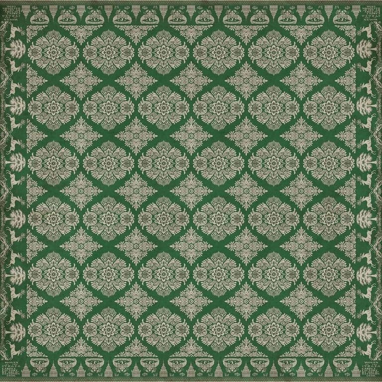 Vintage Vinyl floorcloths feature a two-ply vinyl construction with a latex padded backing, ensuring non-flammability, absence of harmful phthalates, and UV resistance for up to three years.