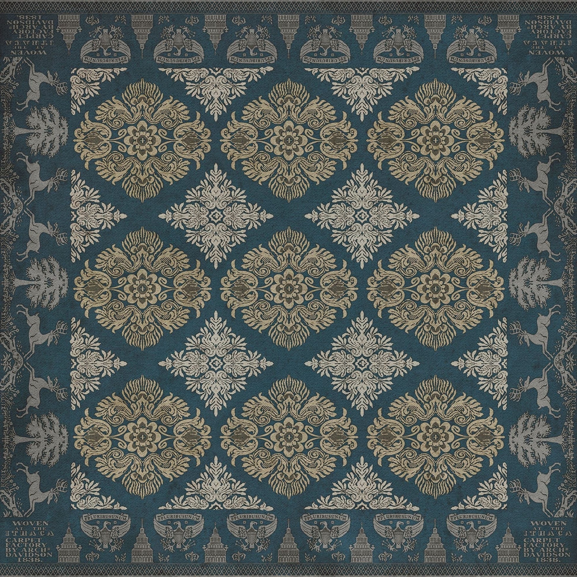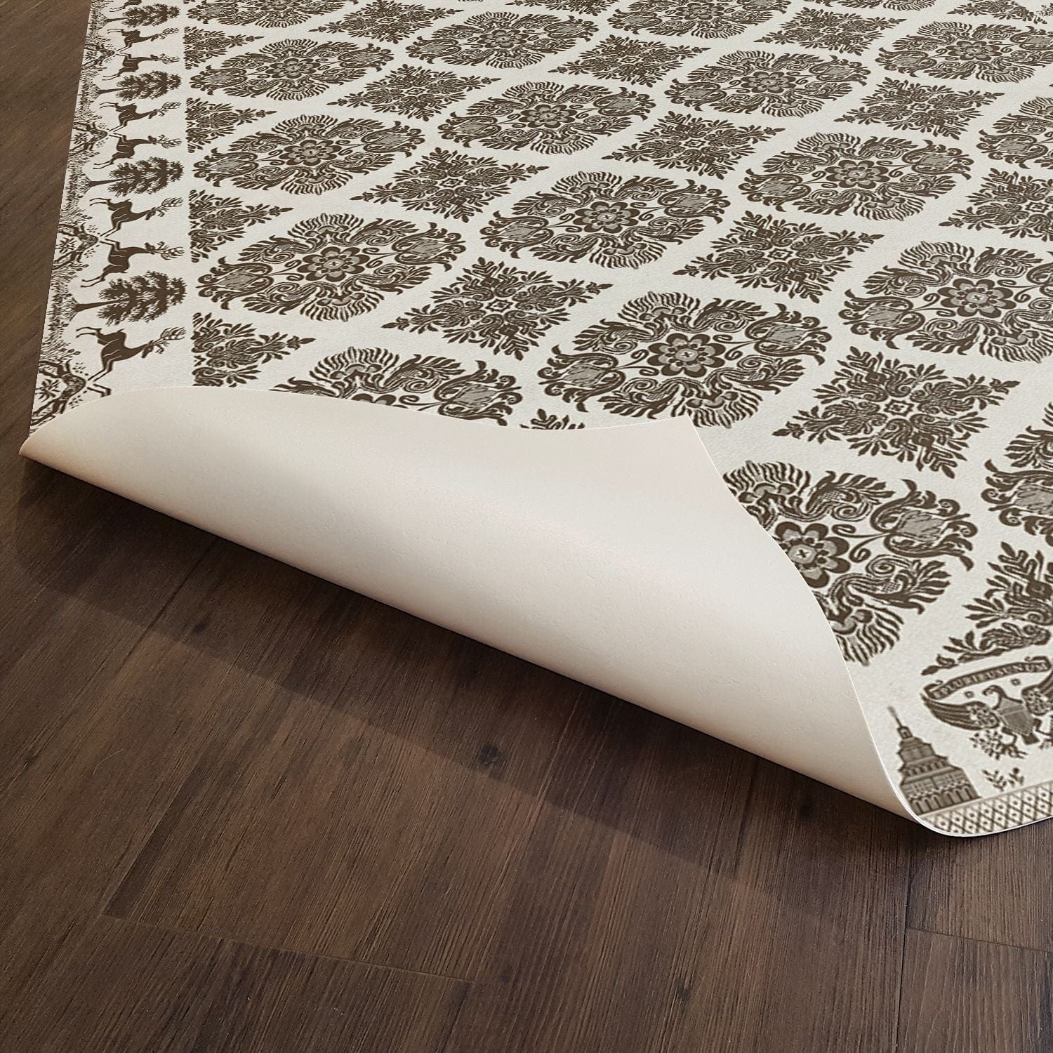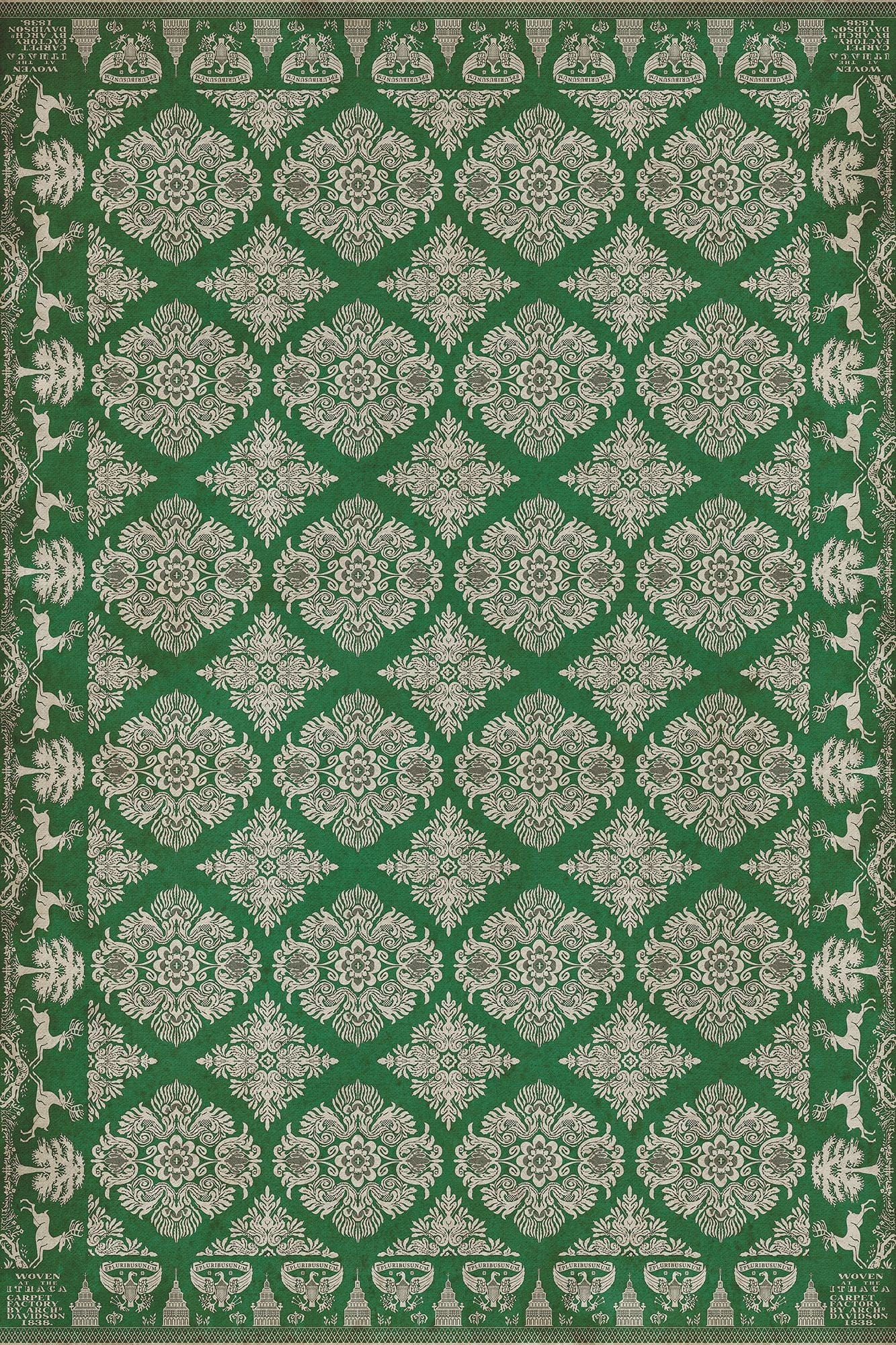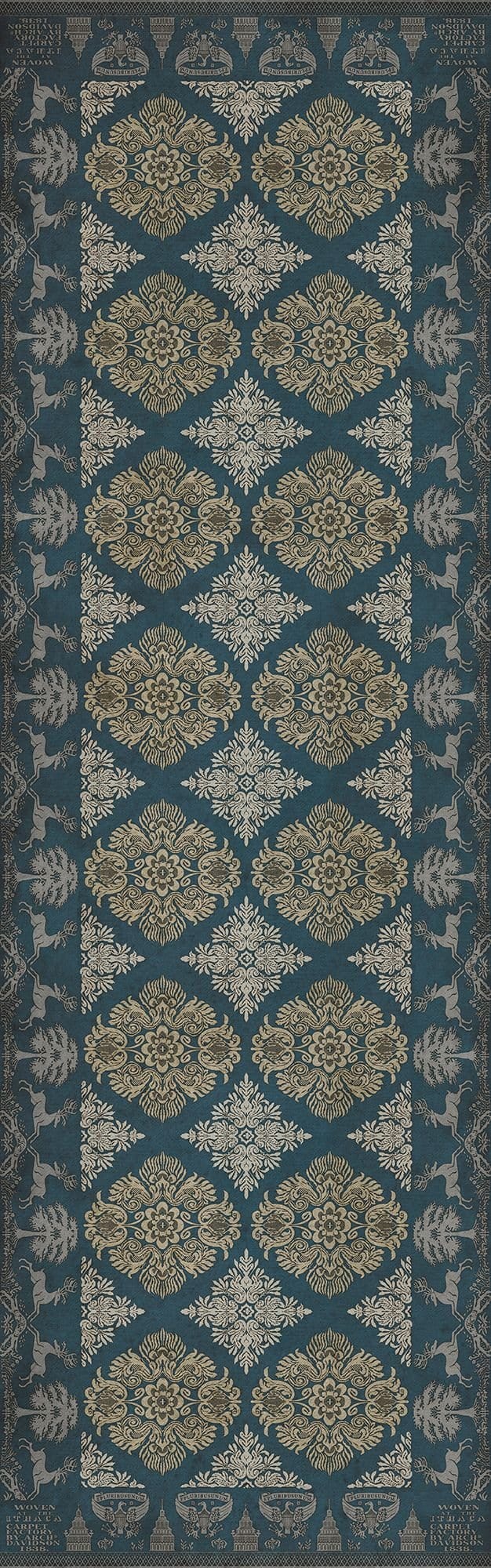 Vintage Vinyl floorcloths feature a two-ply vinyl construction with a latex padded backing, ensuring non-flammability, absence of harmful phthalates, and UV resistance for up to three years.