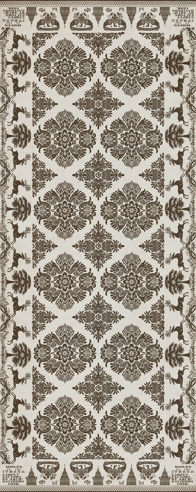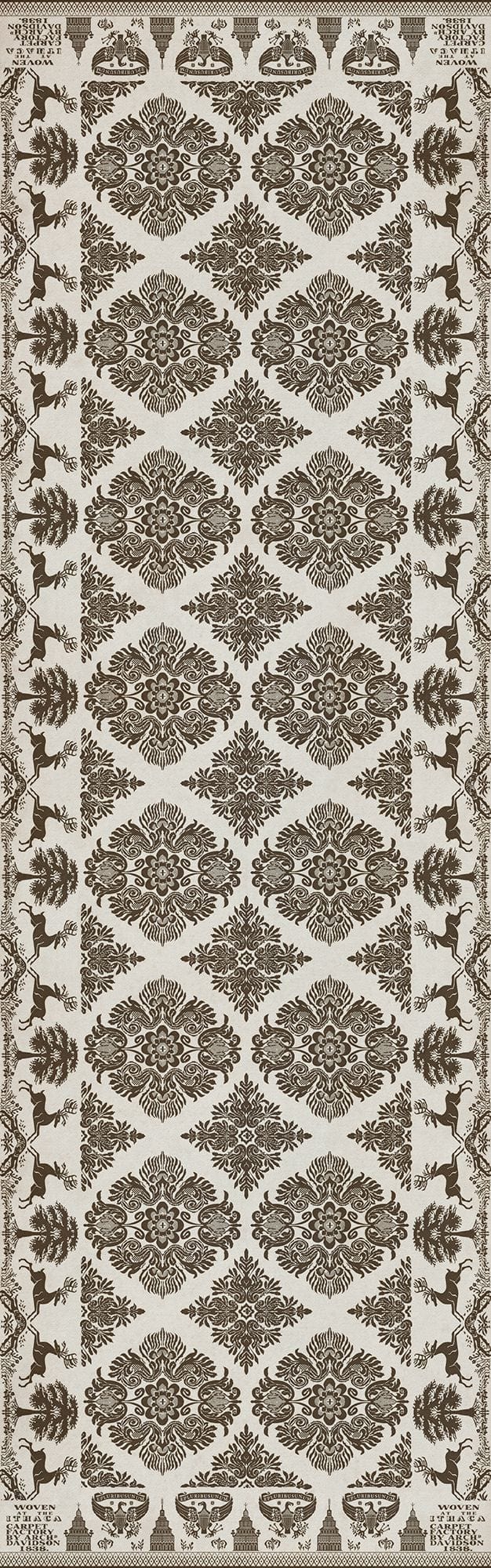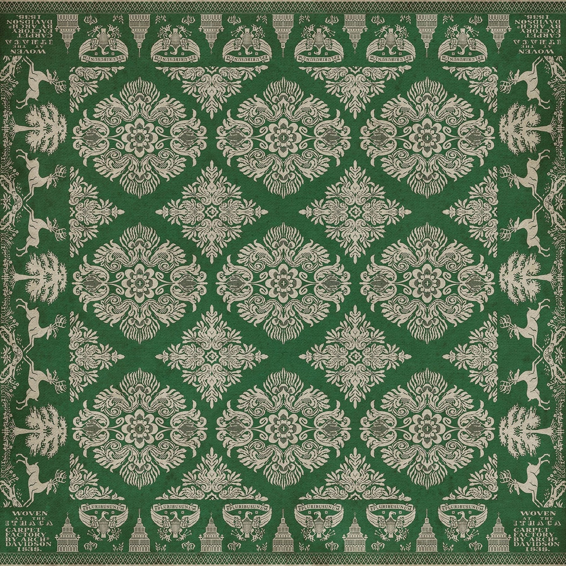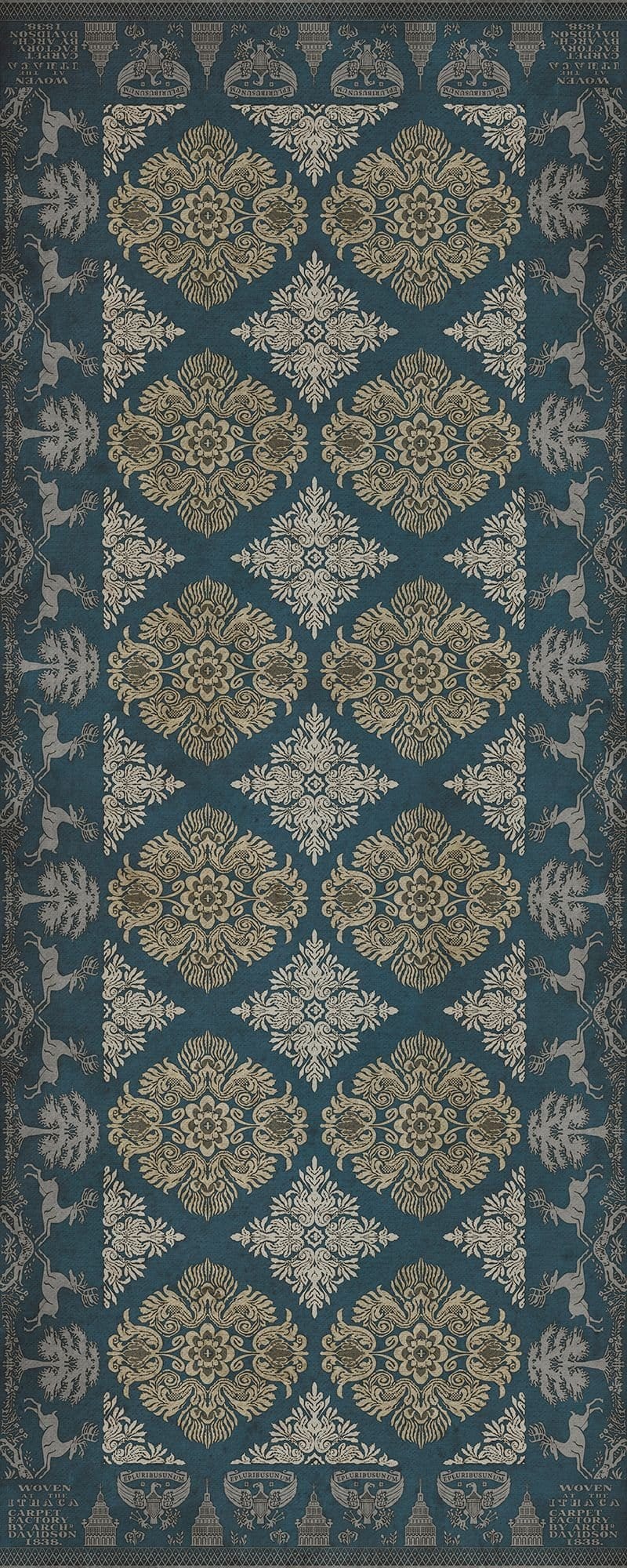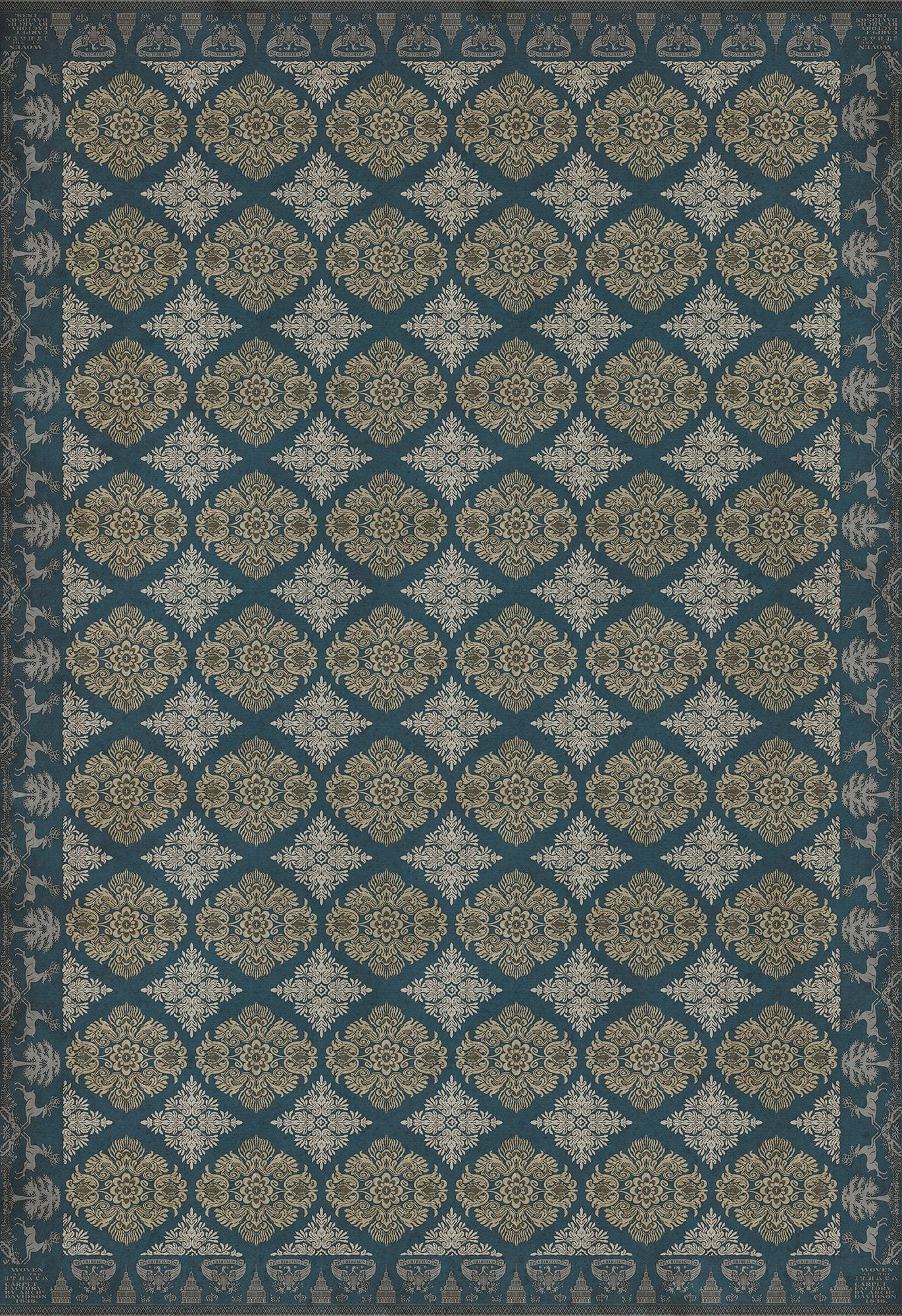 Vintage Vinyl floorcloths feature a two-ply vinyl construction with a latex padded backing, ensuring non-flammability, absence of harmful phthalates, and UV resistance for up to three years.