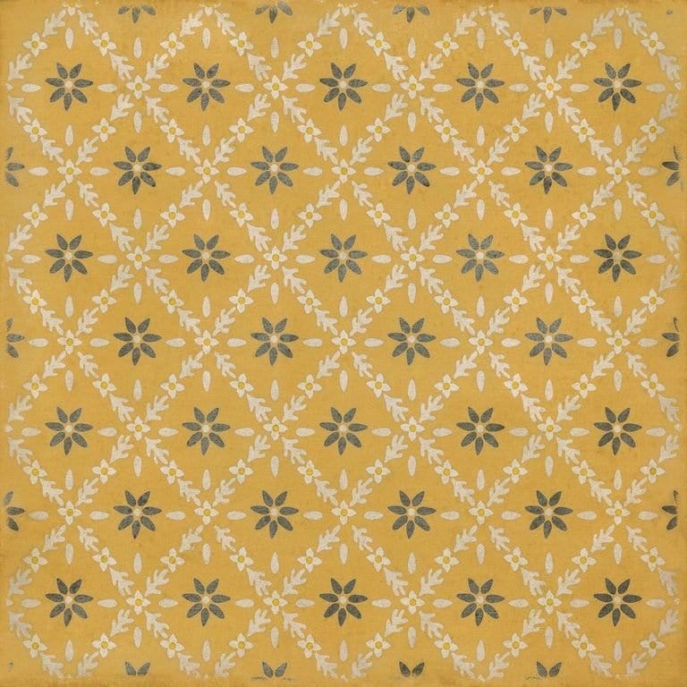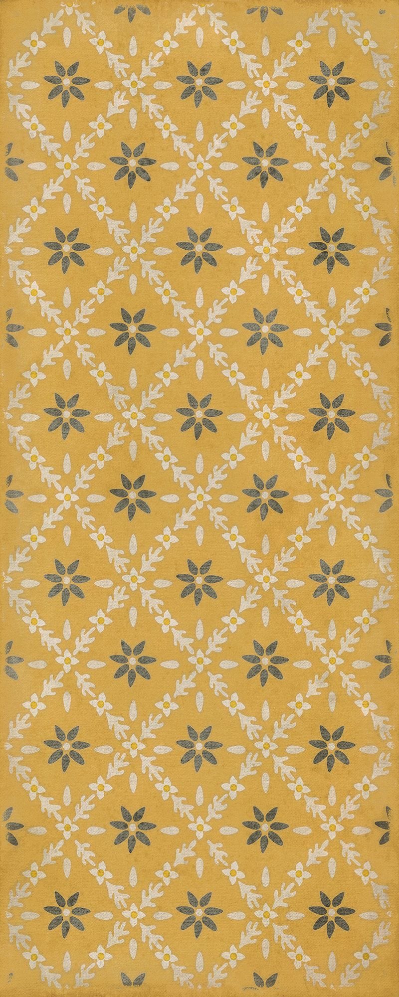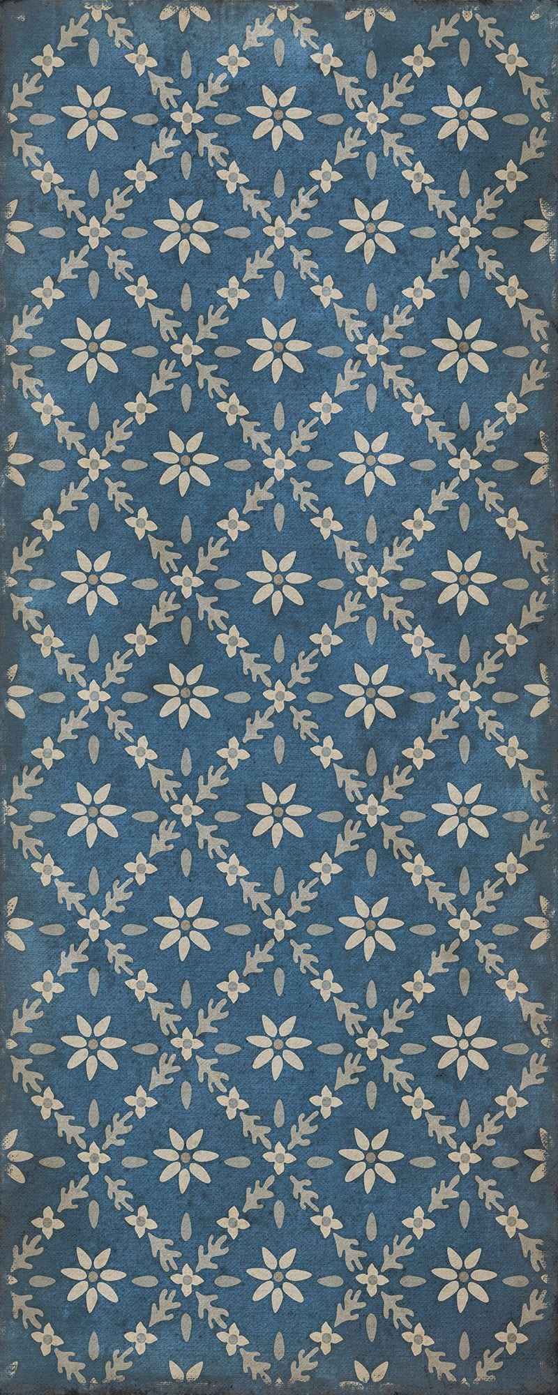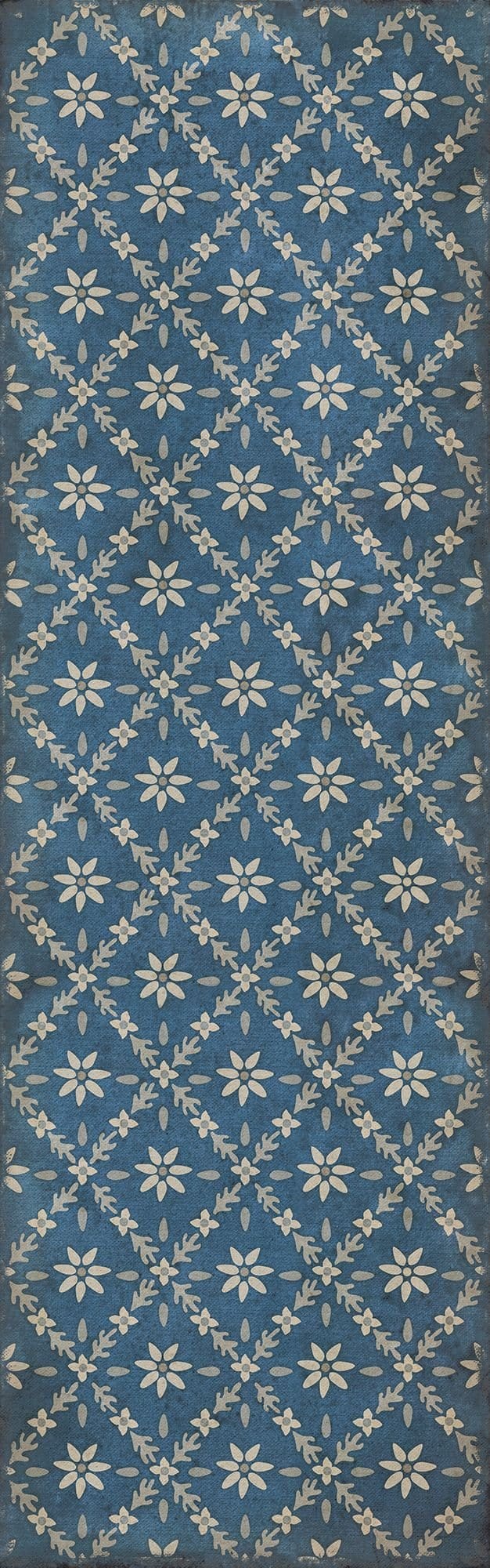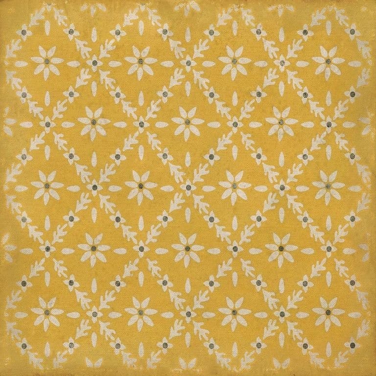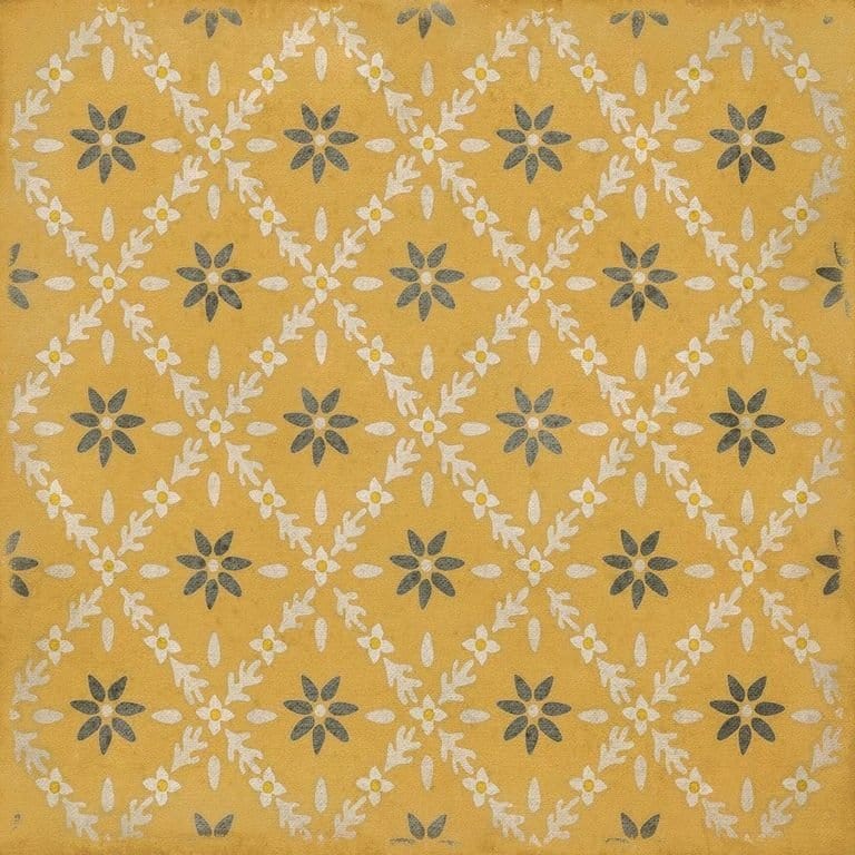 Vintage Vinyl floorcloths feature a two-ply vinyl construction with a latex padded backing, ensuring non-flammability, absence of harmful phthalates, and UV resistance for up to three years.